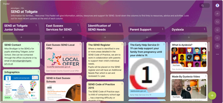 We have made the below Padlet to support our families in finding easy, accessible information about SEND, both in terms of our Tollgate provision and signposting to local services.